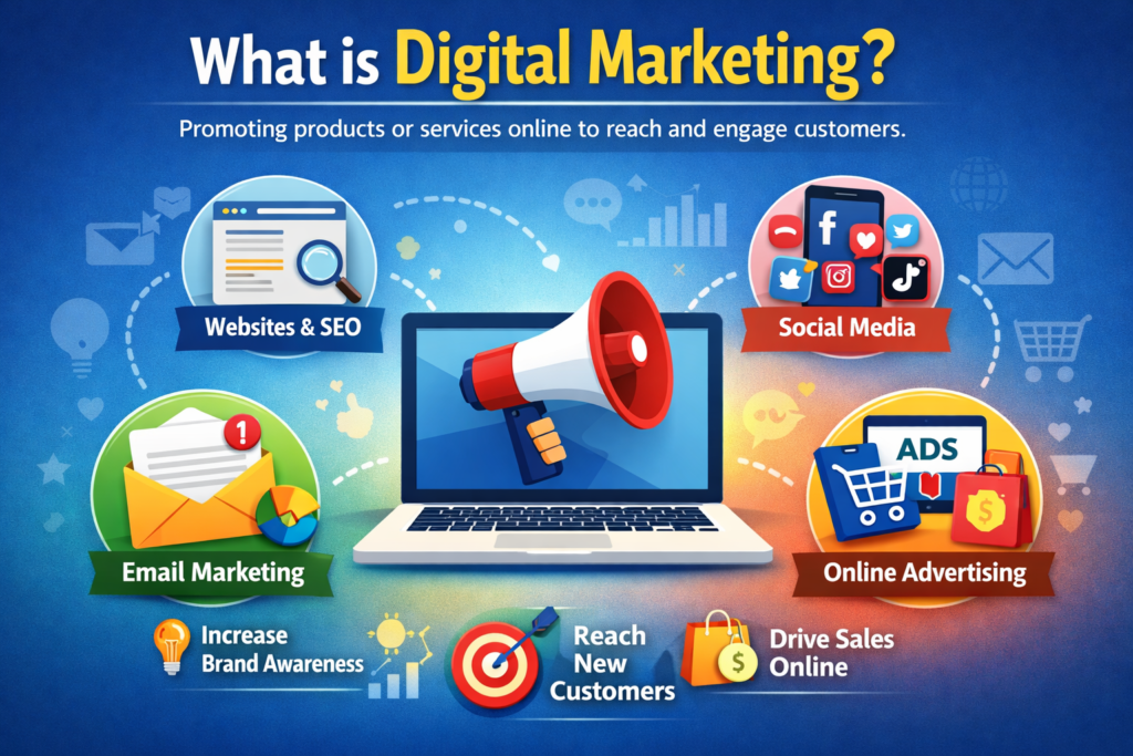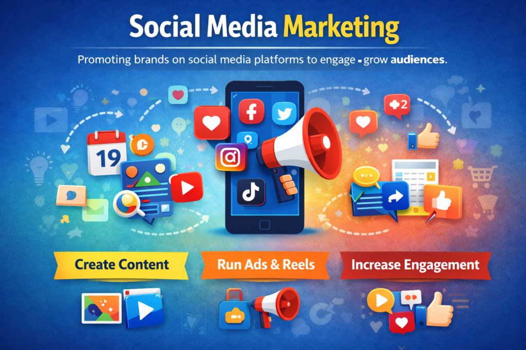 Social Media Marketing is the process of promoting a brand on platforms like Facebook, Instagram, LinkedIn, and TikTok to increase engagement, build brand awareness, and attract potential customers.